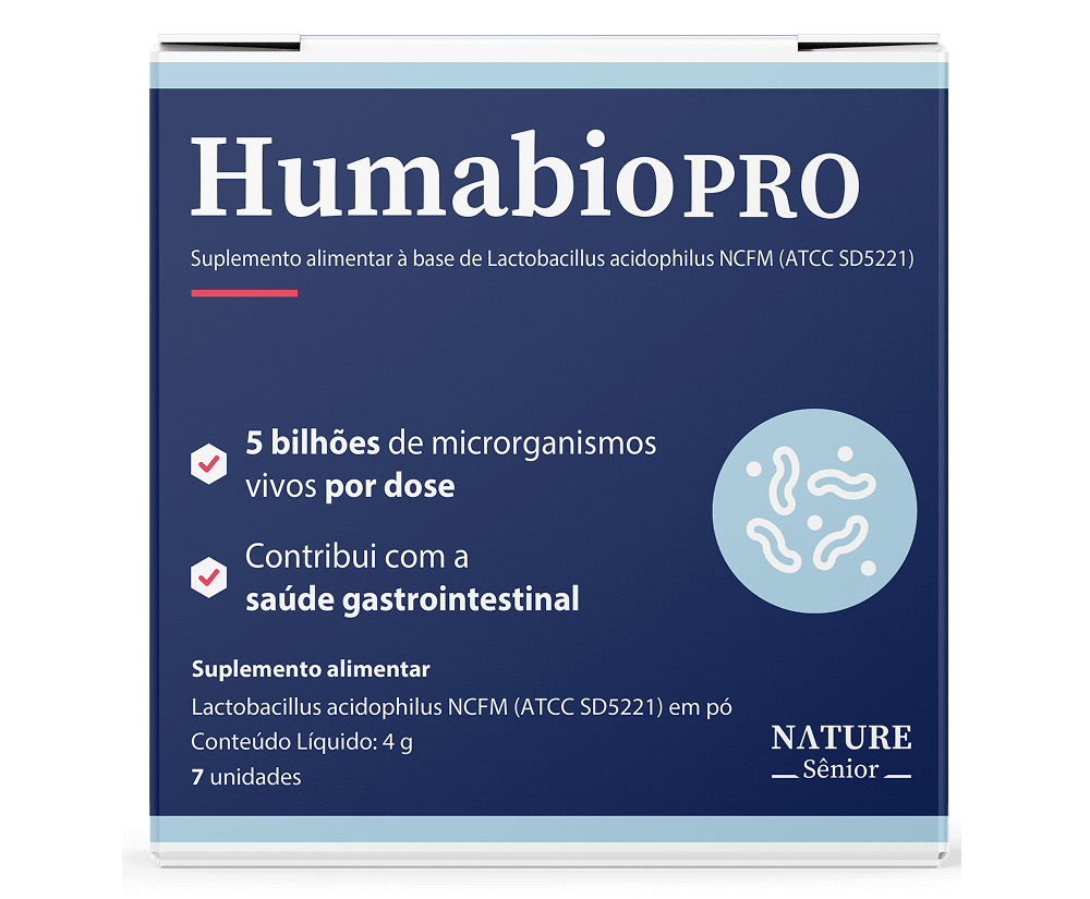 Probiótico premium com 5 bi de culturas ativas e fibras FOS, formulado para contribuir com o equilíbrio da flora intestinal.